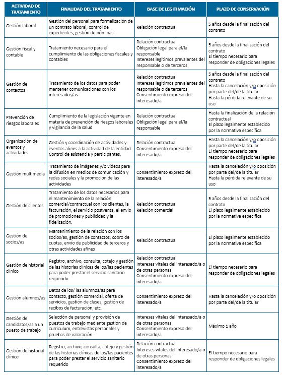 Detallamos a continuación las finalidades de los tratamientos de datos llevados a cabo por alguno, o todos, de los Responsables de Tratamiento enumerados con anterioridad.